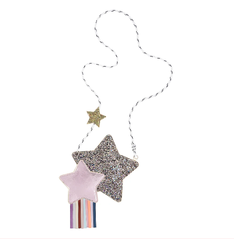 un sogno di borsetta: due stelle rosa, una più grande glitterata e un’altra più piccola rosa metallizzato con una coda di nastri di raso colorati, per un look davvero da sogno!