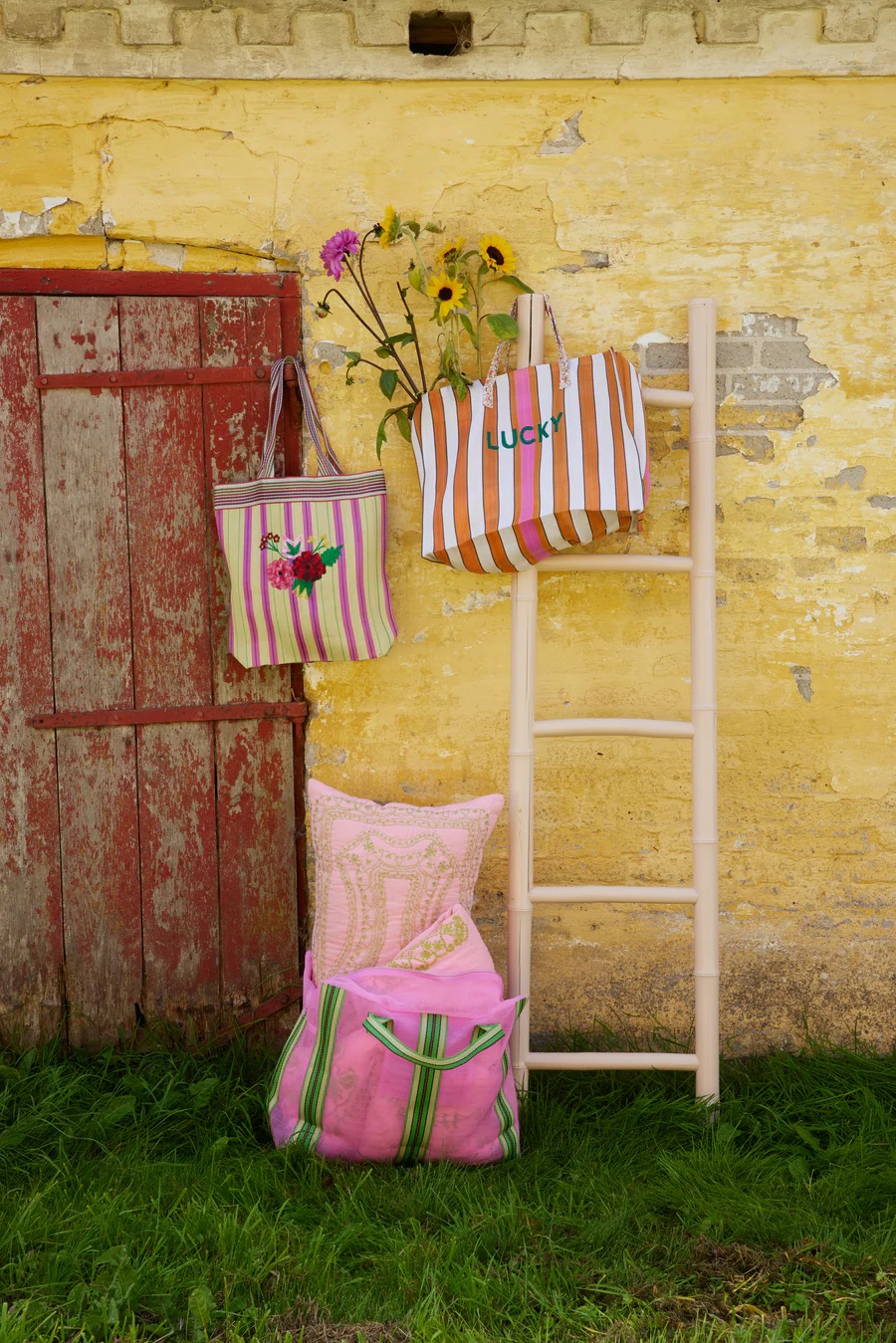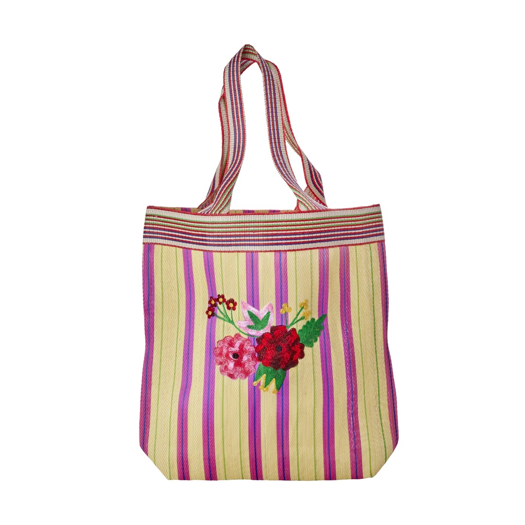 allegra e pratica, la borsa di Rice in plastica riciclata a righe con ricamo floreale disponibile in due varianti di colore: